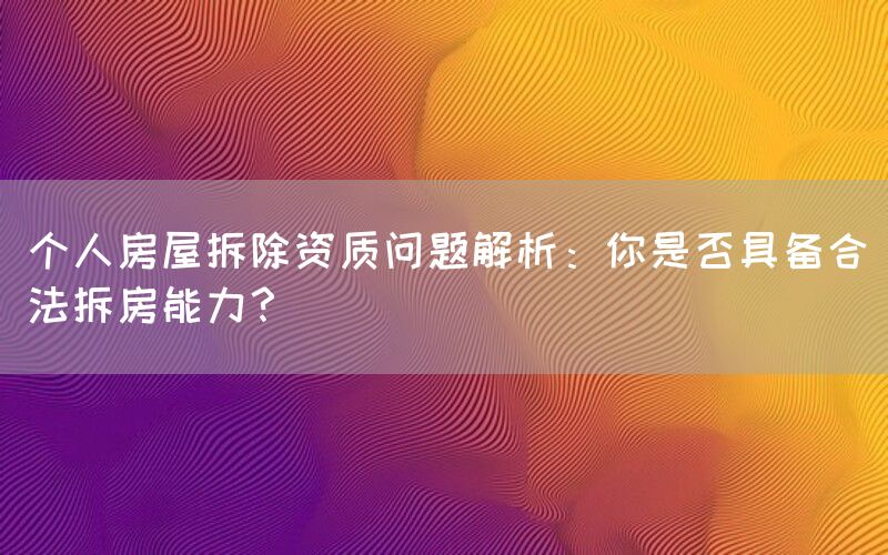 个人房屋拆除是否具备合法拆房能力,需要明确拆除行为的法律依据和资质要求。根据《建筑法》和相关规定,个人房屋拆除须由具备相应资质的单位或个人进行。具备资质意味着该单位或个人经过政府主管部门的审核和批准,具备了进行拆除工作的法律授权和技术保障。