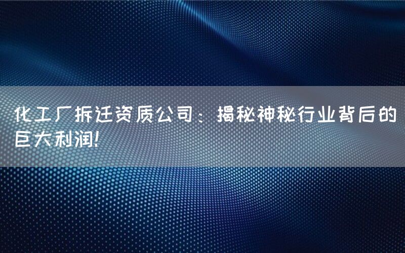 化工厂拆迁是一个备受关注的话题,涉及到环境保护、土地资源利用等多个方面。在这个过程中,化工厂拆迁资质公司扮演着重要的角色。他们不仅提供专业的服务,还能为企业创造巨大的利润。本文将深入探讨这一神秘行业背后的内幕。