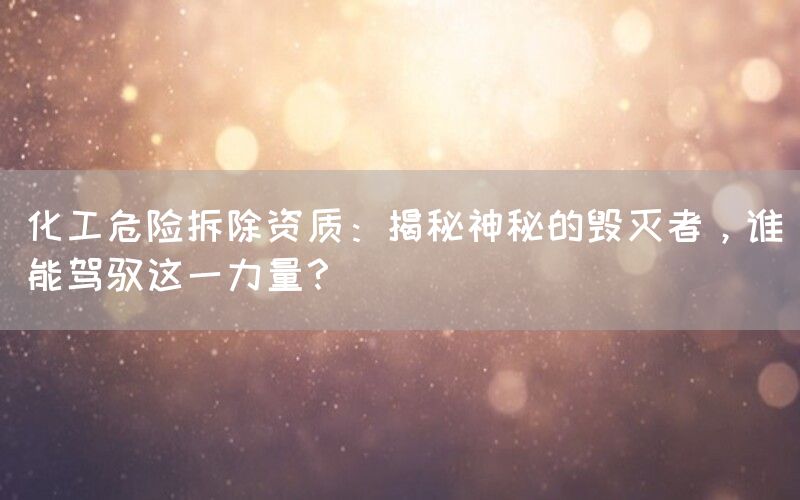 化工危险拆除是一项极具挑战性和风险的任务,需要经验丰富、技术过硬的专业人士来执行。这些毁灭者以其勇敢和无畏的精神,将自己置身于高度危险之中,用他们独特的技能和知识来保护人类免受化学品事故带来的威胁。
