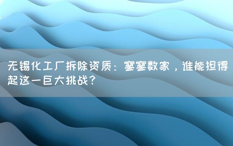 无锡化工厂拆除是一项巨大的挑战,需要专业的资质和经验来确保安全、高效地完成任务。在寥寥数家企业中,谁能够胜任这一重要任务呢?本文将探讨无锡化工厂拆除资质的稀缺性以及解决方案。