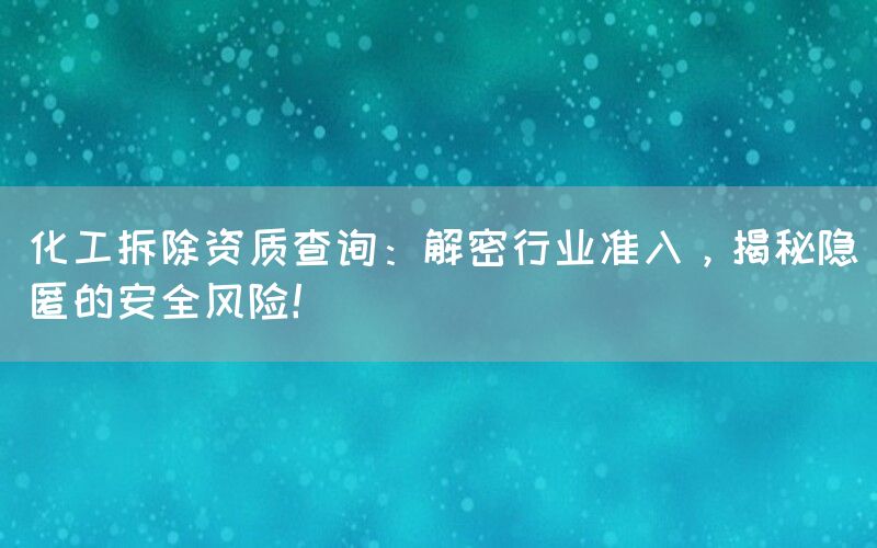 化工拆除资质查询是解密行业准入、揭秘隐匿安全风险的关键步骤。通过查询相关证照、核实专业人员和设备、了解企业的安全管理情况,可以有效筛选出具备资质和能力的企业。我们也应该关注隐匿的安全风险,如伪造证照、操作不规范和潜在危险物质未处理等问题。只有通过严格把关和监管,才能确保化工拆除工作的安全性和可靠性。
